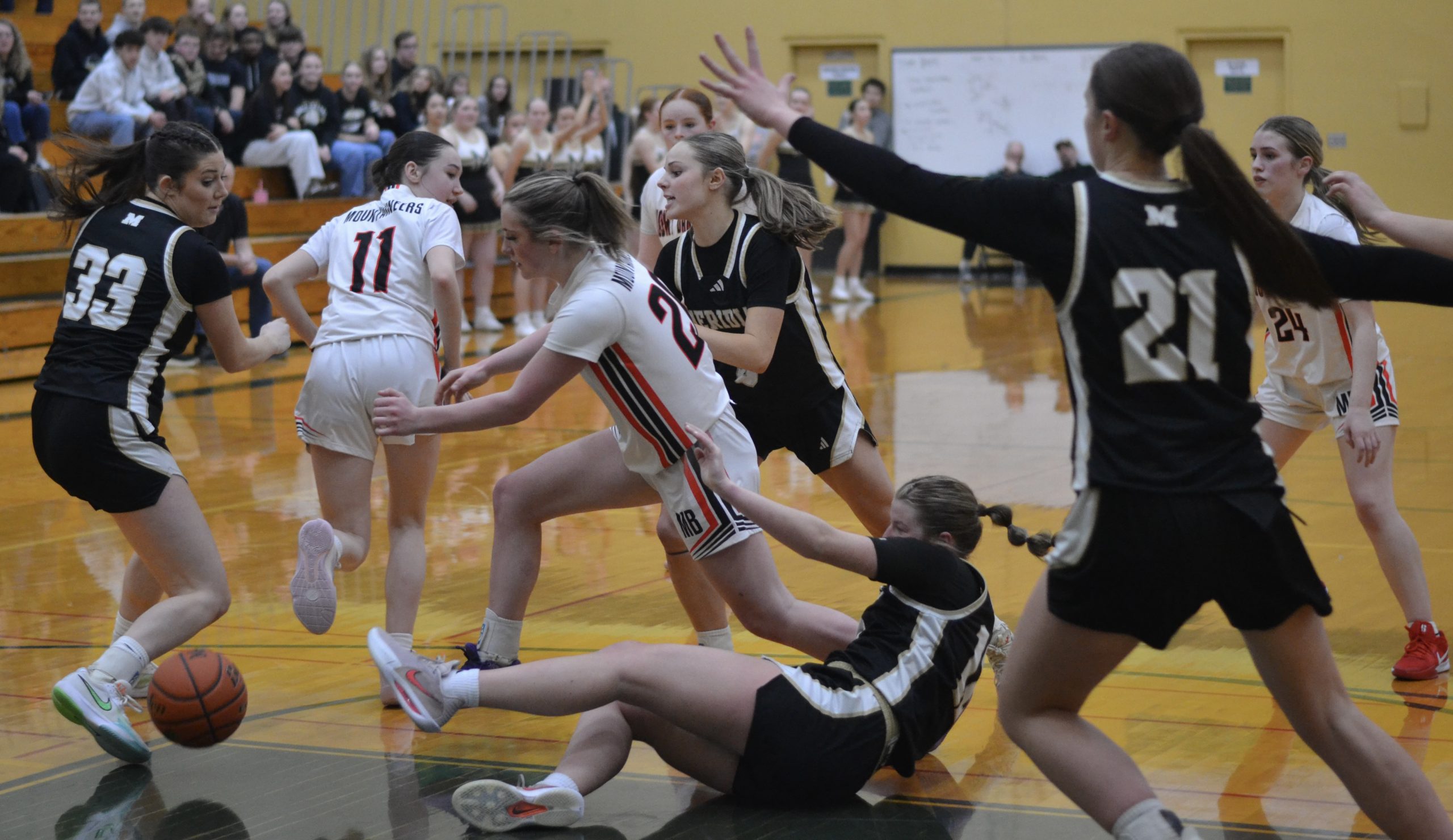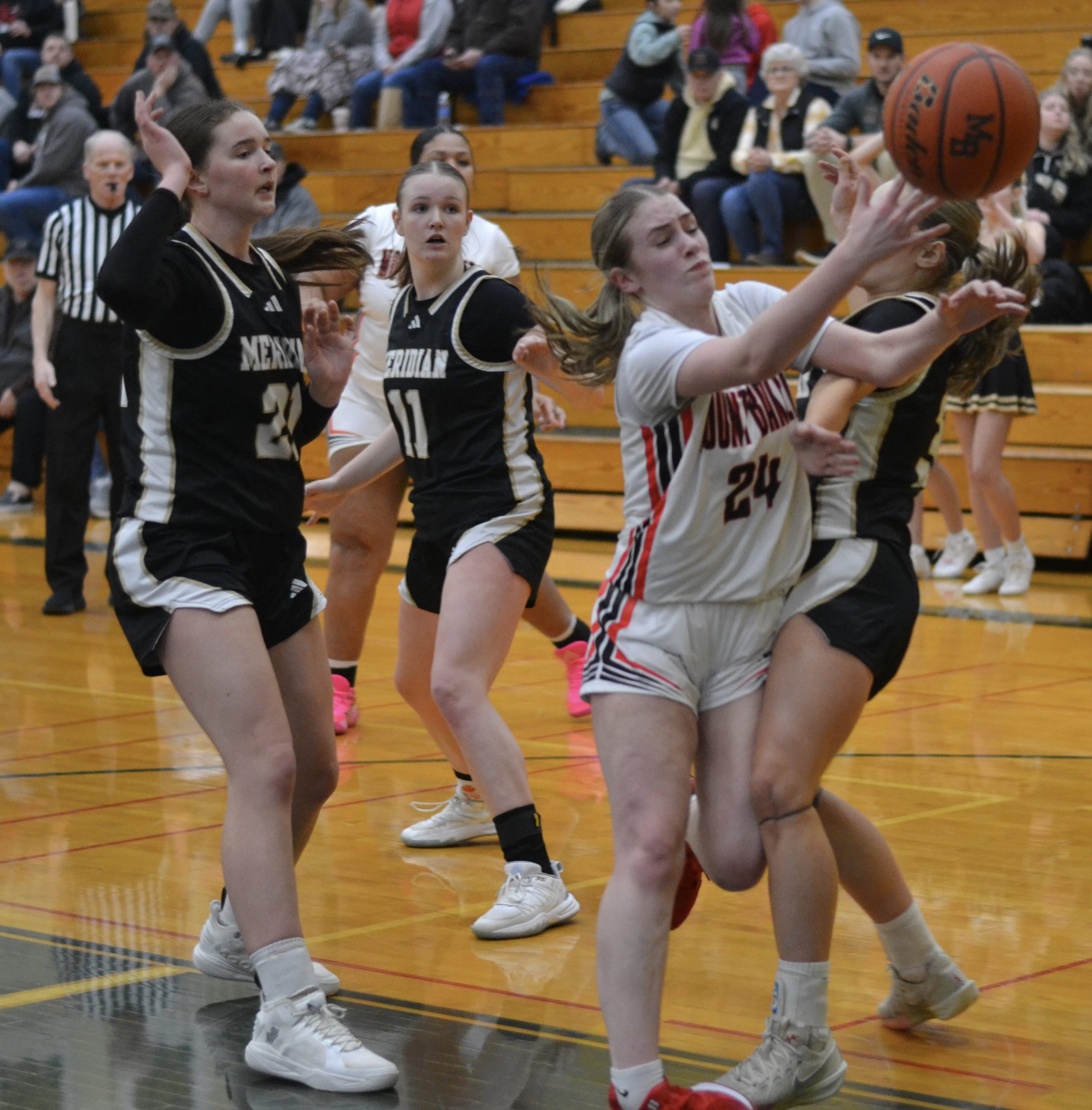 On the final play with the score tied at 44-all, Meridian had the ball with 11.1 seconds left and a chance to complete an incredible comeback. But on the inbounds pass at halfcourt, the Mounties’ tiny Maci Kammenga knocked the ball loose and it bounced into the hands of George.