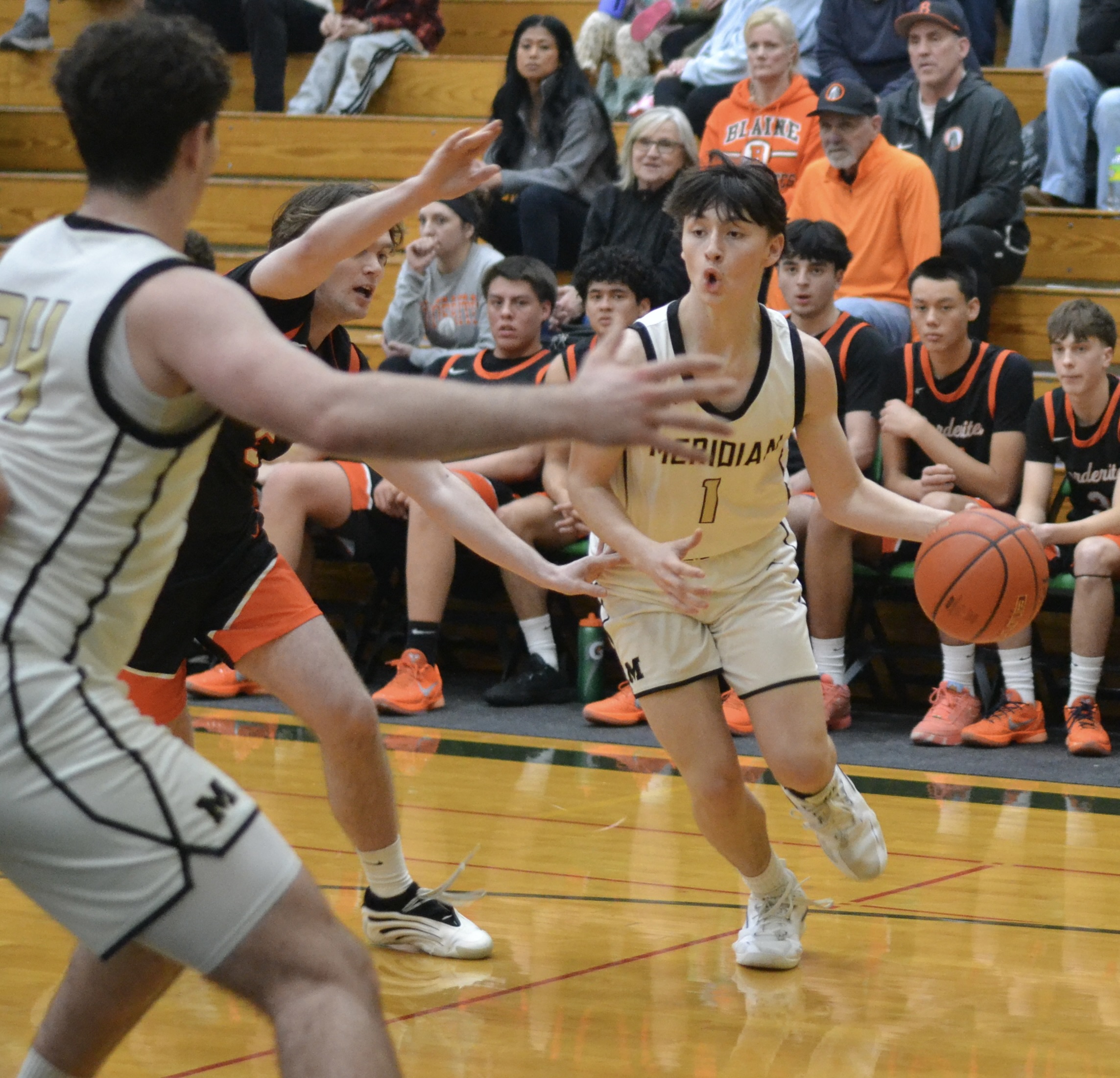 Although Blaine’s patient, disciplined offense didn’t seem made for a big comeback, the Borderites did just that, scoring 19 points in the final period and closing the gap to five with 37 seconds left before Meridian junior Pierce Brzozowski and sophomore Emmett Ashmore hit one free throw each to ice the game.